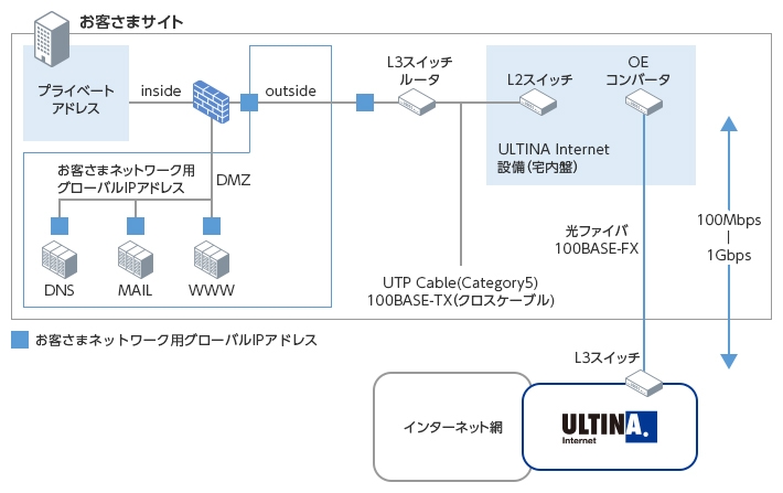 イーサネットアクセス(S)は 、広域性、安定性、拡張性に優れた「ULTINA Internet」バックボーンから光ファイバーをお客さま宅内に直接引き込むことにより100Mbpsから1Gbpsまで安定した通信環境をご提供するサービスです。
