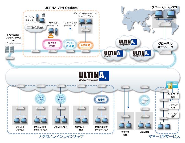 「ULTINA Wide Ethernet」は、豊富なアクセス手段、オプションサービスを備えた閉域網(広域イーサネット)サービスです。