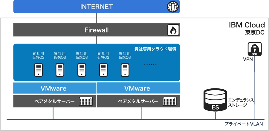 当初、EC/通販のインフラ事業として自社のデータセンターにお客様のサーバをお預かりしていた流れで、専有物理サーバ環境を提供するインフラサービスをはじめましたが、経済性やアジリティなど課題もあったことから、お客様がより導入しやすい仮想環境のインフラとして、パブリッククラウド(IaaS)の検討を進めました。2014年に日本アイ・ビー・エムから「SoftLayer®※2」をご案内いただき研究を進めるなか、2015年の冬に東京データセンターがオープンしたことも後押しし、2016年に入ってすぐ、IBM Cloudによるインフラ構築を手がけたのが最初です。その後、EC/通販事業から独立する形でインフラ事業を立ち上げ、構築から運用・保守まで必要なすべてをフルマネージド型で提供する本サービスに至りました。2016年からの7年間でお客様は優に50社を超えましたが、EC/通販関連の用途は数社で、基幹系や業務システムなど比較的大規模な汎用インフラとしてのご利用がほとんどです。