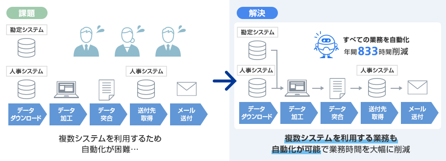 例:領収書未提出者に督促メールを送付する、複数システムを利用した複雑な業務を、すべて自動化する