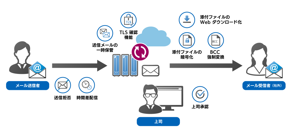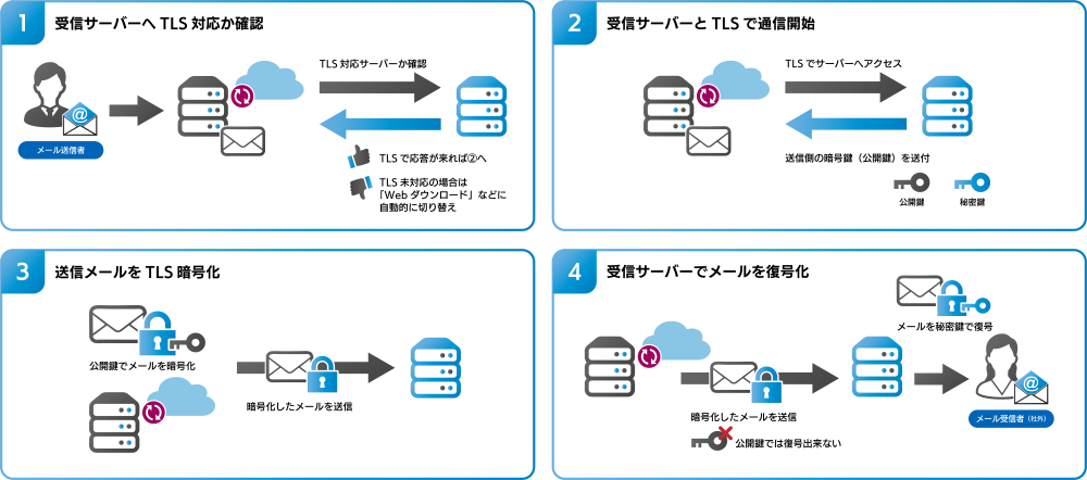 対応しています。さらに、TLSによるメール暗号化や添付ファイルのWebダウンロード化機能を標準で搭載しており、