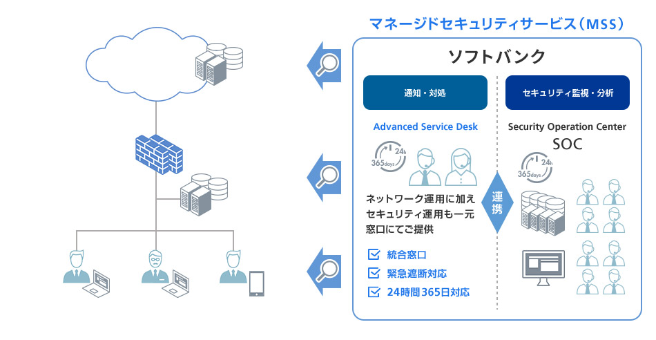 ソフトバンクのマネージドセキュリティサービス(以下、MSS)は、24時間365日体制でさまざまなサービスに対するセキュリティ監視・分析・対処を行います。