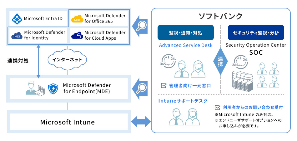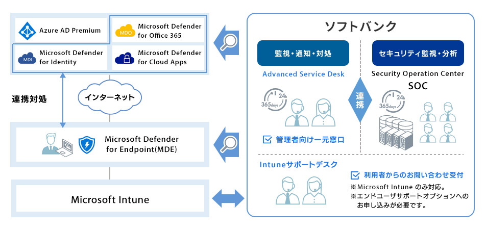 ソフトバンクではMicrosoft 365を安全にご利用いただくためにマネージドセキュリティサービスでセキュリティ監視・運用をトータル支援いたします。