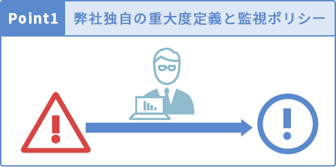 MDIのアラートに判定基準を加え重大度を決定し、通知を実施します。また、ソフトバンク独自で監視ポリシーを用意しており、お客さまのご要望に応じて監視対象とさせていただきます。