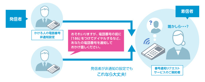 電話番号を「通知しない」でかけてきた相手に対し、通信設備上で「メッセージ」にて応答し、着信を規制するサービスです。