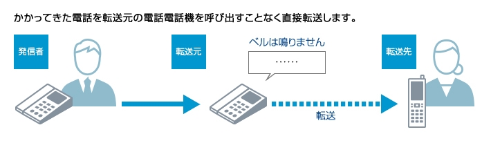 外出中や離席中でも、携帯電話や固定電話へ転送することができます。外出先(携帯電話)からも転送開始・停止、転送先変更が可能です。