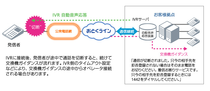 着信お断りサービスは、迷惑電話を受けた直後、電話から登録操作を行うことで、以後同じ電話番号からかかってきた場合に着信を規制するサービスです。