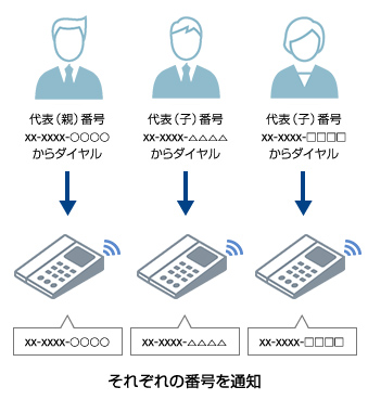 「代表取扱サービス」をあわせてご利用の場合、発信する際、相手先に代表親番号を通知するサービスです。