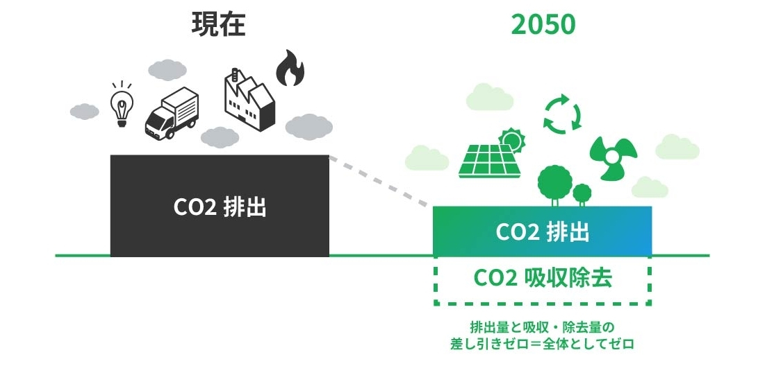 2020年10月、政府は2050年までに「温室効果ガスの排出を全体としてゼロにする」カーボンニュートラルを目指すことを宣言しました。具体的には、私たちが生み出す二酸化炭素(CO2)や他の温室効果ガスの排出量を削減し、その排出量を相殺するために、再生可能エネルギーの利用や植林活動などを行います。つまり、カーボンニュートラルを実現することで、私たちの活動が地球環境に与える悪影響をゼロに近づけることが目指されています。