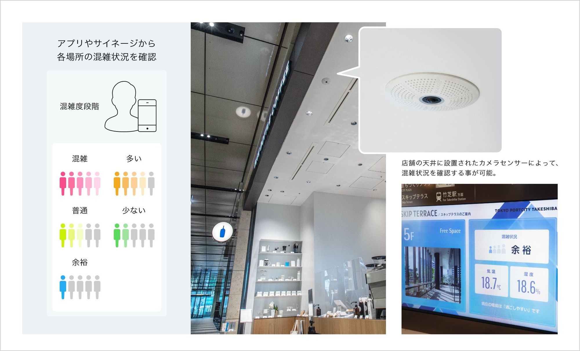 東京ポートシティ竹芝では、共用エリアのフリースペースをはじめ、テラス、エレベーターホール、飲食店などのテナント店舗など、至るところにAIカメラやセンサー(Vayyar Smart Building Sensor)を設置し、混雑状況を検知・分析しています。そこから得られる情報は専用アプリやデジタルサイネージにリアルタイムに配信。空いている場所が一目で分かり、混雑を回避できます。