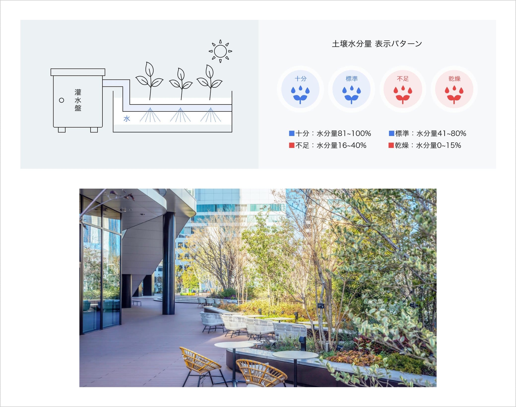 スキップテラスにある植栽の土壌水分をリアルタイムにモニタリングし、水分量に応じて、自動で灌水盤を制御。管理者によるこまめなメンテナンスが必要だった業務の効率化を実現しています。