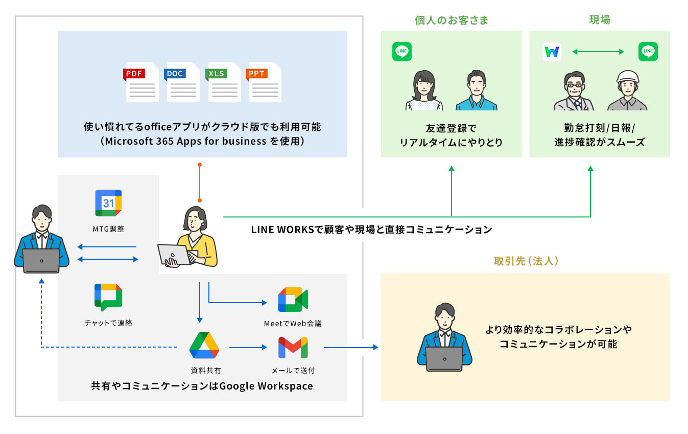 コミュニケーションの根幹はGoogle Workspace 、資料作成はローカル環境でも使えるMicrosoft 365 と無理に1つにまとめず、両ツールの強みを活かした活用をすることも可能です。