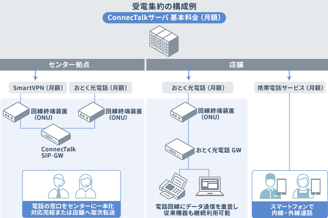 受電集約は店舗にかかってくる電話にコールセンターのオペレータが応答し、店舗従業員の負担を軽減できる仕組みです。