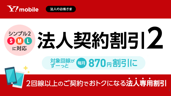 ワイモバイルの「法人契約割引2」は、法人名義で同一請求内にシンプル2 S/M/Lまたは、シンプルS/M/Lを2回線以上ご契約頂いた場合に、シンプル2 S/M/Lの基本使用料から最大870円(税抜)割り引くサービスです。