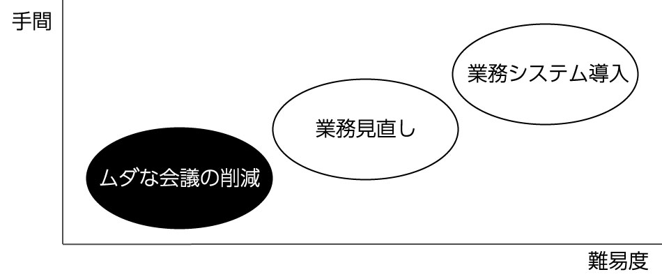 「業務システムの導入」や「業務プロセスの見直し」は、時間とコストがかかりがちです。そんな皆さまは、第一に「ムダな会議」の削減から検討ください。多くの職場で普遍的な課題であり、ITツールで手軽に効率化できます。