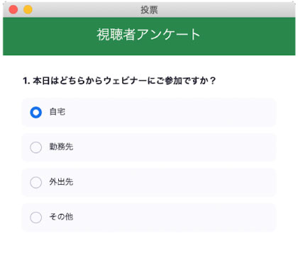 事前に質問文と選択肢を用意しておきます。受講者の回答内容は自動集計されます。