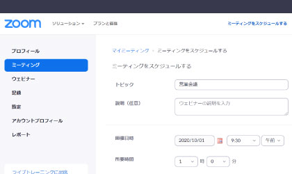 Zoomアプリにログインし、ミーティングボタンをクリックして開催日時やミーティングパスワードを設定します。ミーティングのテキストをコピーして参加者にメールやチャットで招待します。