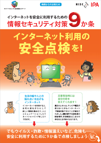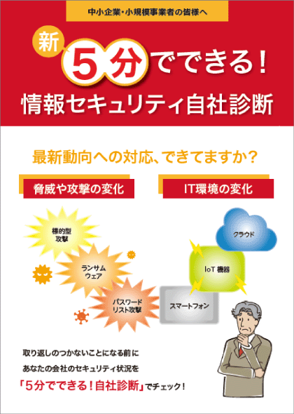 IPA 独立行政法人 情報処理推進機構の『5分でできる!情報セキュリティ自社診断』と、NISC 内閣サイバーセキュリティセンター『情報セキュリティ対策9か条』をベーシックなセキュリティ基準としてご紹介します。