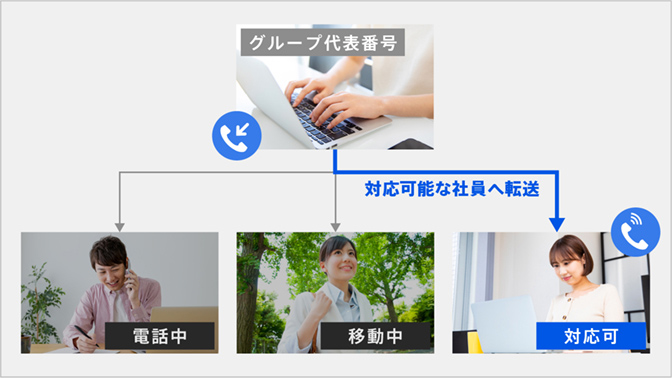 電話の対応を分散させたいときはグループ番号が便利です。話し中やミーティング中の人に代わって別のメンバーが対応できます。