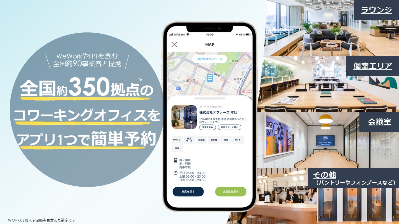 「WORKUS」は、全国約350拠点でさまざまワークスペースを30分単位で利用できます。主要駅だけではなく、自宅の近くや出張先などでもいつものオフィスと同様の業務環境が提供可能です。