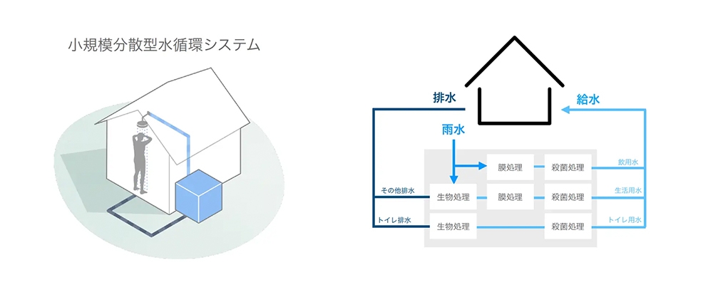 こちらは水処理自律制御をコア技術に膜処理と生物処理を実装したプロダクトで、住居の側に設置することで、
