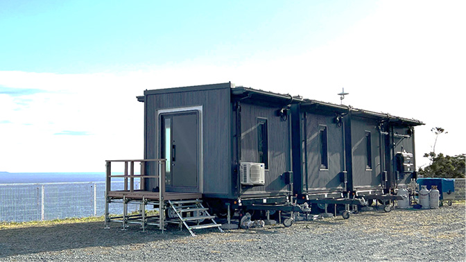 この利島村の水課題を解決するために、2023年6月から「オフグリッド居住モジュール」の検証を開始しました。このモジュールにはWOTAが開発する「小規模分散型水循環システム」や 太陽光発電システム、ソフトバンクの通信機器などの居住に必要な水・電気・通信のすべての機能が搭載されています。