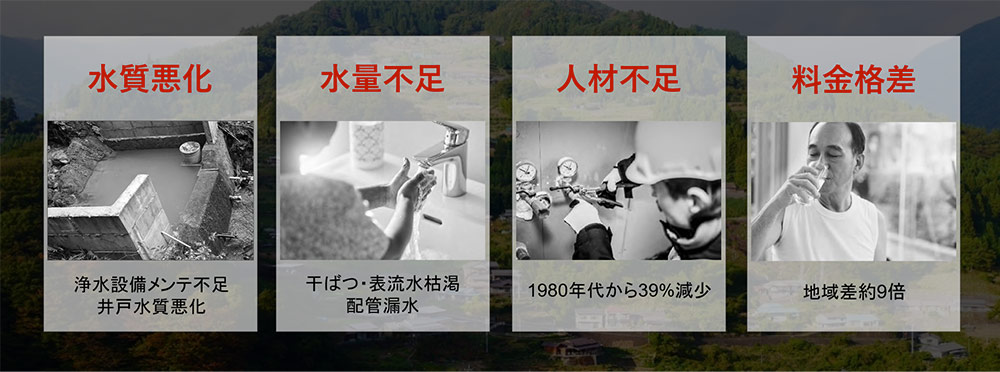 財政面以外にも水質悪化や水量不足、人材不足、地域間での料金格差などさまざまな課題が浮き彫りになっています。