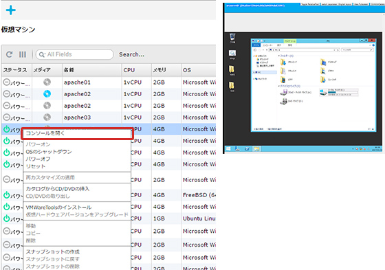 仮想マシンを右クリックし、コンソール仮想マシンへアクセスしてみてください。