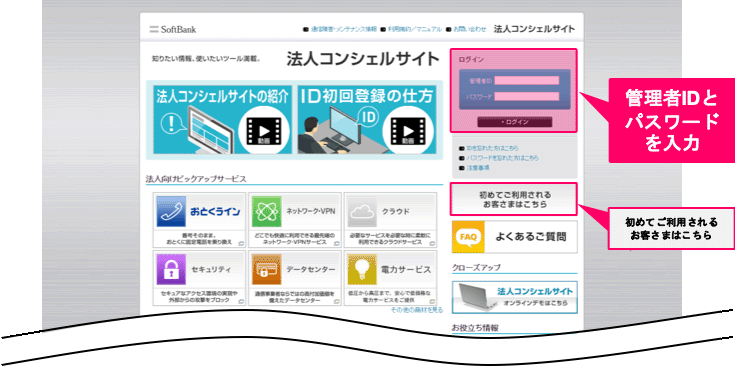 事前にご登録いただいた管理者ID、パスワードで「法人コンシェルサイト」のログイン画面よりログインしてください。
