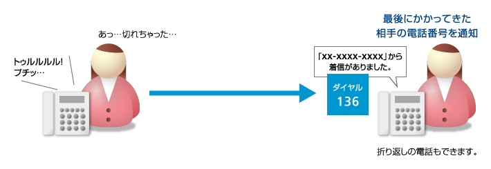 着信番号案内サービスは、最後にかかってきた相手の電話番号を知りたいときに「136」をダイヤル、ガイダンスに従って操作することで相手先の電話番号を音声でお知らせするサービスです。