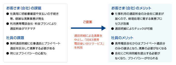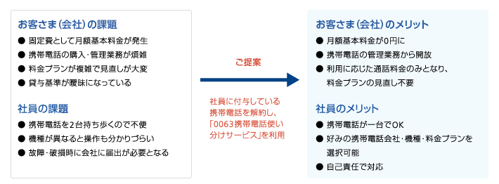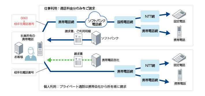 「0063携帯電話使い分けサービス」とは、社員所有の携帯電話から仕事用の通話をする際に「0063」をつけるだけで、通話料金が自動的に会社請求にできるサービスです。