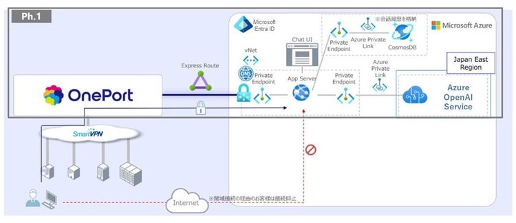 「高いセキュリティが担保された環境を一番重視したかったので、閉域ネットワークサービスのSmartVPNとOnePort※でつなぐ構成をご提案いただきました。閉塞空間で生成AIを導入できる環境が決め手になりました」(安藤氏)