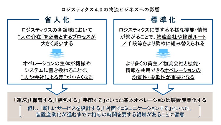 人でなければできない操作や作業が減少し「省人化」が可能になる。また、物流に関するさまざまな機能や情報がつながることで、プロセスを柔軟に組み替えられるようになり、あらゆる場面で「標準化」されたサービスの提供が可能になります。