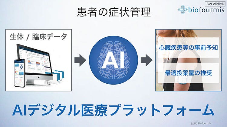 AIを活用して心臓疾患の事前予知や最適投薬量などを知らせるデジタル医療プラットフォームを手がける「Biofourmis」。410万人の患者データを解析し、バイオマーカー(特定の病状の指標)、どんな治療をしたらどんな結果になったかなどのデータを分析。その結果、心不全を14日前に99%の精度で予測することを可能にした。急な心不全で亡くなる人や再入院率を減少させることにつながり、医療費の削減にも役立てることができる。