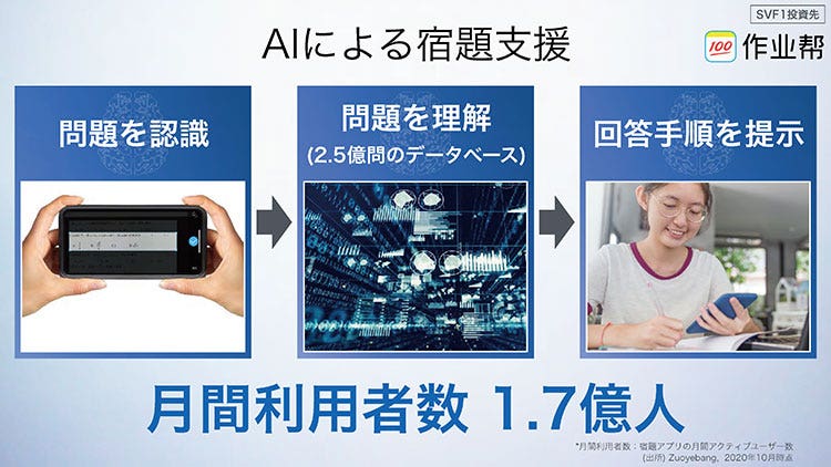 中国の「Zuoyebang(作业帮)」は、スマホで問題を撮影すると瞬時に回答手順と答えを提示してくれる。問題を理解するために2億5千問のデータをAIに蓄積させており、問題を認識すると瞬時にマッチングさせる仕組み。中国では月間アクティブユーザ数が1億7千万人に到達。AIが出してくれる類似問題をいくつも解くことで、学生は問題の理解をより深め、問題を解く能力を身につけることができる。