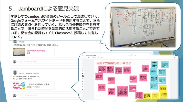 会議ツールとしてGoogle Jamboard(デジタルホワイトボード)も積極的に活用しています。もともと校内研究の検討会において模造紙・付箋紙を用いたワークショップの文化が定着していたため、Jamboardをすぐに受け入れることができ会議の効率化が進みました。今は「Classroomにアップしておくね」「Jamboardの画像を共有してほしい」「Google フォームに回答しておいて」というつぶやきが日常的に交わされています。