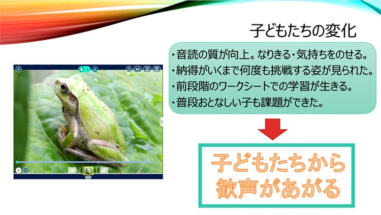 2020年末のiPad導入当時、新たな実践に対しては教員から期待の声・不安の声が入り交じっていました。しかし2021年3月ソフトバンク主催「動画作成ソフトを用いたiPadの研修」に参加後からiPadに対する不安・抵抗感が和らいだように感じています。前年度はコロナ禍で中止を余儀なくされた「新1年生を迎える会」ではiPadの動画撮影機能を活用したイベントが行われ、以降も全学年でiPadを用いた「思考力・判断力・表現力」を高める授業実践が進められています。