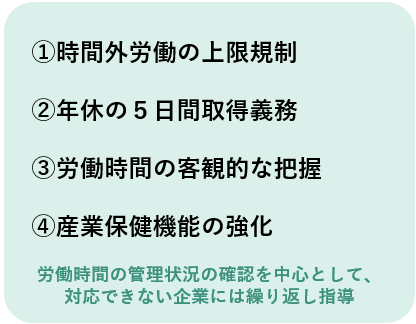 労働行政では、主に4つのポイントを中心に指導を行っています。
