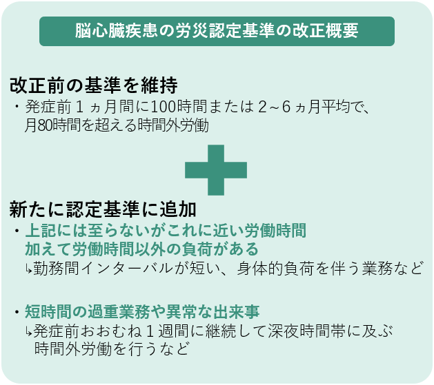 2021年9月には 「脳心臓疾患の労災認定基準」が改正 されました。これまでは、1ヵ月に100時間、あるいは2~6ヵ月平均で月80時間を超える時間外労働を行っていた労働者が脳心臓疾患を発症した場合は労災認定するとしていました。この基準は「過労死ライン」と呼ばれていますが、このラインを越えなければ労災ではないと判断されてきました。