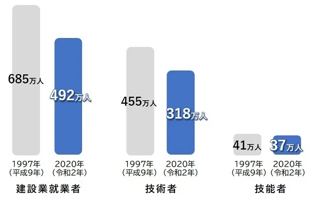 - 建設業就業者: 平成9年|685万人 →令和2年| 492万人