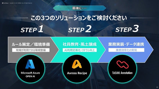 西原「1点目が、ツール展開だけでなく、いかに推進策とセットで進めていけるか。2点目が、身近な風土を育むことを意識できるか。3点目がデータ連携を見据えた上でデータの構造化も環境準備と同じくらい優先着手していただくことです。ソフトバンクではそれぞれのステップに応じたソリューションを取り揃えているので、ぜひご検討・ご相談ください」