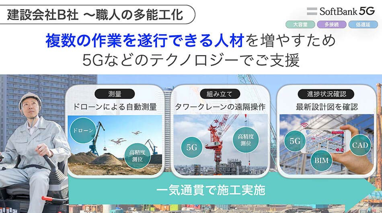 そこでソフトバンクでは、建設業の皆さんと議論を重ね、例えばドローンを使った自動測量や、タワークレーンなどの遠隔操作など、労働力不足を補うテクノロジーについて実際に現場でさまざまな試みをしています。そこで分かったのは、やはり測量ひとつにも非常に精度が高いものが求められることです。