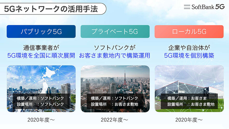 プライベート5Gとは、全国に順次展開されるパブリック5Gと、企業や自治体が個別に構築するローカル5Gの中間的な立場にあり、キャリアであるソフトバンクとしての力を発揮できる領域だという。