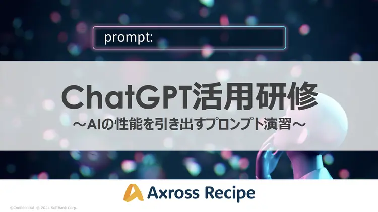 ChatGPTのビジネス活用において「どうすれば良い文章が生成できるのか?」「入力した情報が漏えいしないのか?」などのお悩み・心配を抱えている組織にオススメな、実務に即活用できる研修です。Axross Recipe for Biz内の1コンテンツを、特別に単体でご提供します。