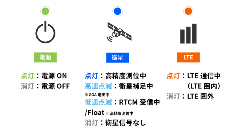 - 電源を投入すると自動的にLTE通信が開始され、補正情報の受信による測位が始まります。
