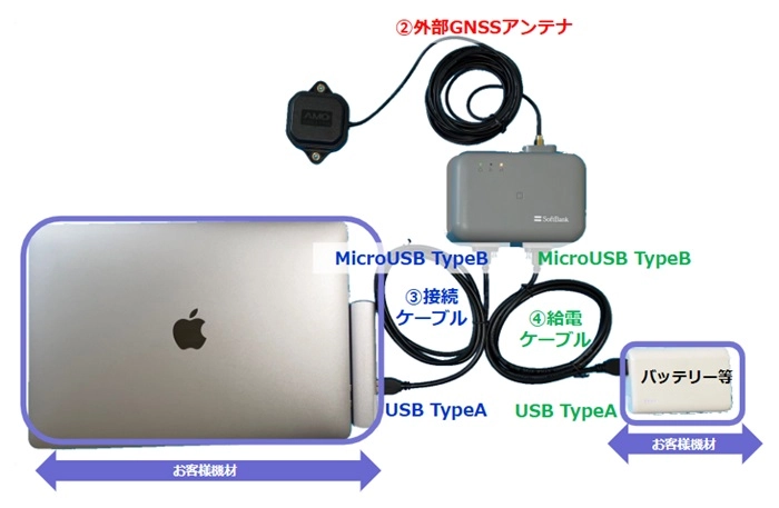 電源用とローカル出力用ケーブルは、それぞれご利用ください。(ケーブルは2本利用) - 外部GNSSアンテナを必ずご利用ください。