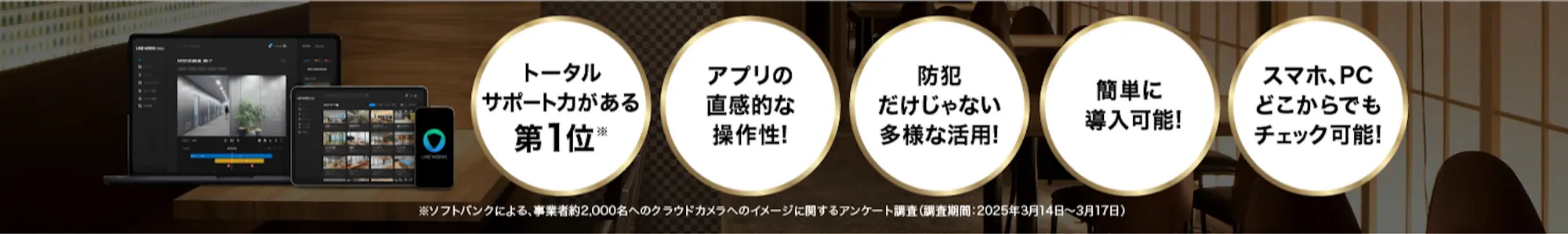 「LINE WORKS Vision」は、ソフトバンクによるトータルサポートと、LINE WORKSによる洗練されたアプリの使いやすさにより、防犯だけではなく飲食店のあらゆる活動をより効率的にサポートするクラウドカメラサービスです。
