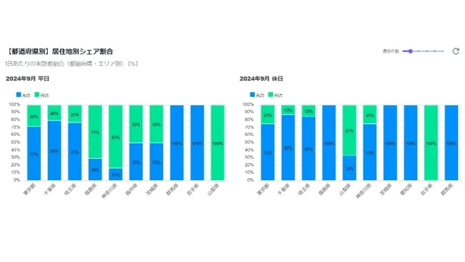 来訪者数の推移(日別、週別、月別)、居住地別ランキング、居住地別シェア率、性年代別、ペルソナ別などの分析結果を数クリックで表示できます。操作画面では人流データを集計加工したグラフが自動で生成され表示されるため、データの扱いに慣れていない方でも、自社や競合店の来訪者分析や、商圏ポテンシャル分析などを簡単に行えます。