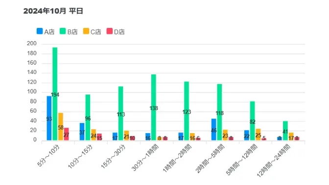 ⾃店舗と競合店舗の時間帯別来訪者数や属性、滞在時間別比率、さらには来訪者の居住地区別の人数を分析できます。⾃店舗と競合店舗の違いを把握することで、競合店舗との差別化を図る企画立案に活用できます。