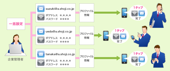 Eメールのアドレス、パスコードロックや、ソフトバンクWi-Fiスポットなどを設定したプロファイル情報を従業員へ一括で配信できます。